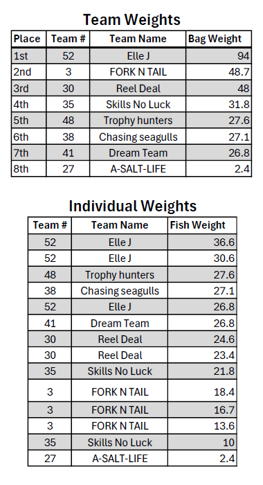 Team 48 – Trophy Hunters with a bag weight of 27.6 pounds and collects $315 dollars and the following prizes: A Dexter Dextreme 3-Knife Fillet Kit & Hat, AFTCO Lure Set, FishDope 1-yr Gift Certificate, Everingham Bait Brothers 1/2 scoop of bait, Custom Engraved One Cool Tuna 4 Gold Jig, YETI Flask Blue #1, Deckhand 18-can soft cooler, pair of Costa Sunglasses, 2 YETI Yonder Bottles.